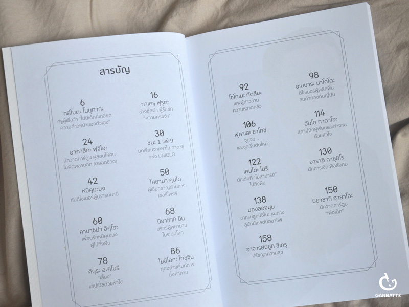 หนังสือเล่มนี้รวบรวมเรื่องเล่า 19 เรื่อง ของชาวญี่ปุ่น 19 คน มีตั้งแต่เรื่องของคนตัวเล็กๆ อย่างคุณครูโรงเรียนมัธยม ช่างซักผ้า บริกร ไปจนถึงเจ้าของแบรนด์ UNIQLO ฯลฯ ทั้ง 19 คนมีสิ่งที่เหมือนกันคือหัวใจที่มุ่งมั่น