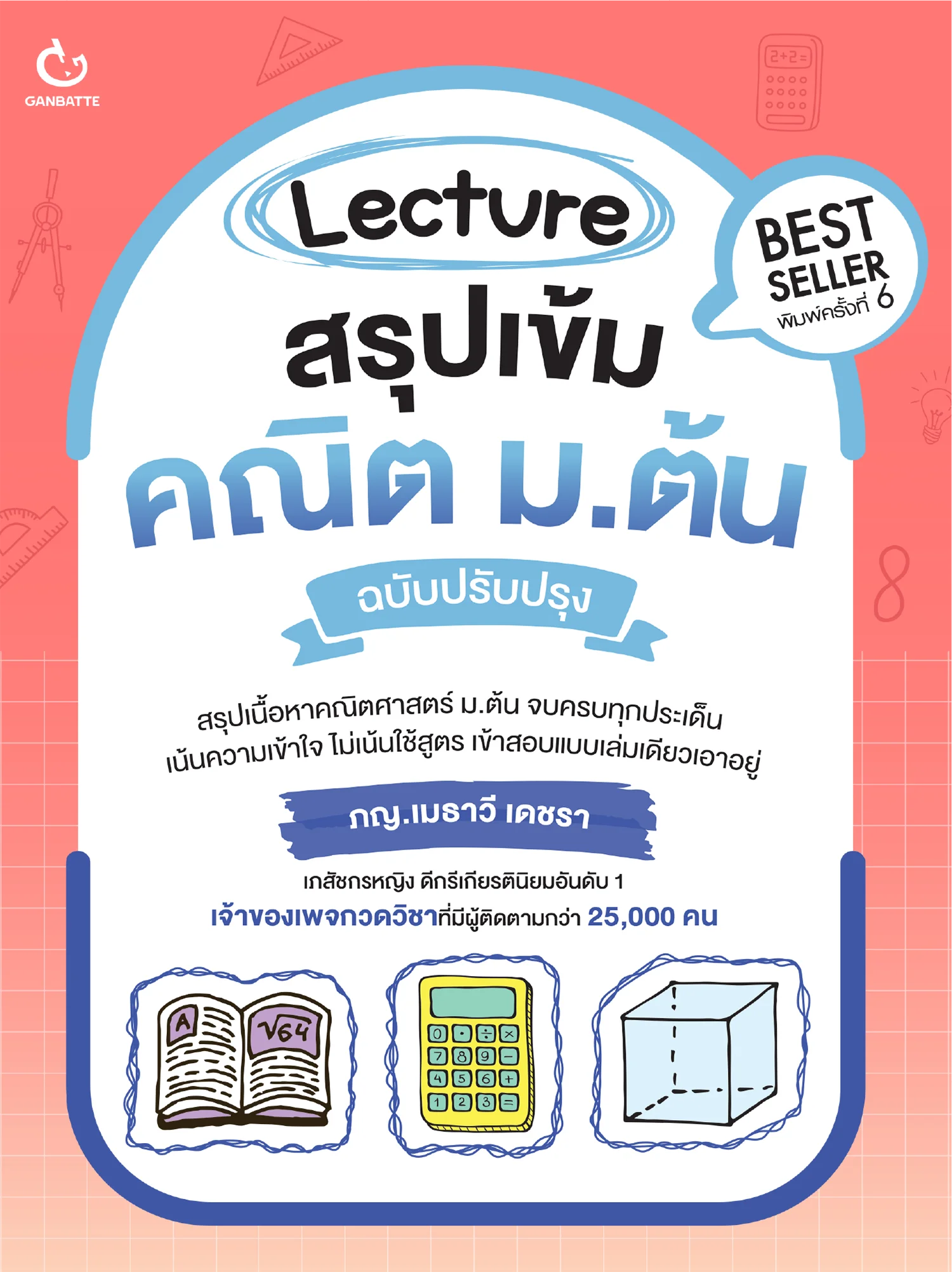 สำนักพิมพ์กัมบัตเตะชวน พี่เม-ภญ.เมธาวี เดชรา เจ้าของเพจกวดวิชากับพี่ควายน้อย ซึ่งเต็มไปด้วยสรุปเนื้อหาและโจทย์วิชาคณิตศาสตร์ที่น่าสนใจ มาเขียนหนังสือ “Lecture สรุปเข้มคณิต ม.ต้น” เล่มนี้ เพื่อให้น้องๆ ทุกคนทำความเข้าใจคณิตศาสตร์ได้สะดวกขึ้น พี่เมไม่เพียงสรุปเนื้อหาของชั้น ม.1-3 เท่านั้น แต่ยังมีตัวอย่างโจทย์ที่มักออกสอบ พร้อมแสดงวิธีคิด แทรกเทคนิคและหลักในการแก้ปัญหาไว้ตลอดเล่ม ทั้งหมดนี้มาในรูปแบบของเลกเชอร์ หากลองพลิกไปอ่านเนื้อหา จะพบว่าหน้าตาเหมือนยืมสมุดจดของรุ่นพี่มาอ่านอย่างไรอย่างนั้น